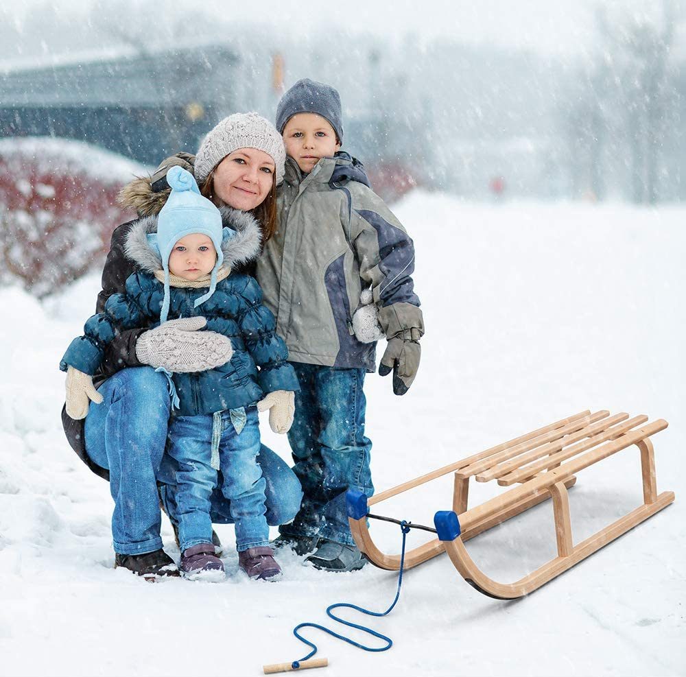 There are plenty of types of sleds, but I found the wooden ones way more reliable than the plastic ones. They last longer, kids can sit easily with an adult behind, they are more maneuverable and, yes, I had one of those when I was a kid. You can order a wooden one here. Or This one being another option (affiliate links).